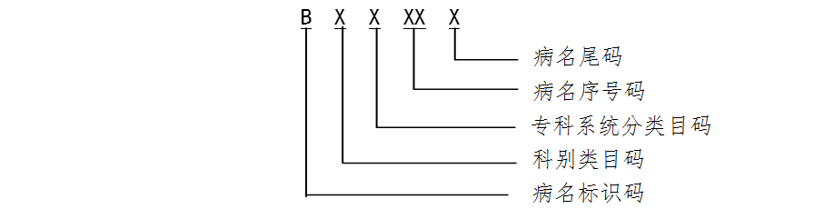 中医诊断编码使用“95国标”,包含中医病名和中医证候名编码,均为由阿拉伯数字和大写英文字母组成的6位码。中医病名和证候名编码结构见图3。